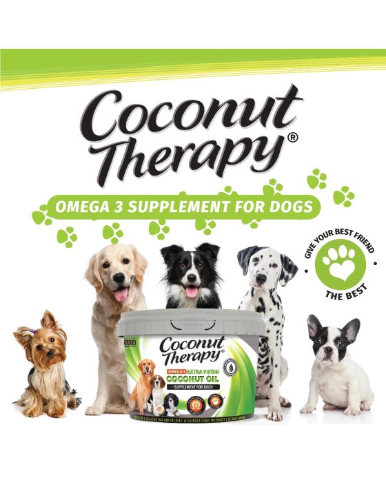 Use as a conditioner to make coats become sleek and glossy: rub a small amount of Coconut Therapy on your hands and then massage in into your dog’s coat. Let the oil soak in for 15 minutes and then wash your pet with soap and water.