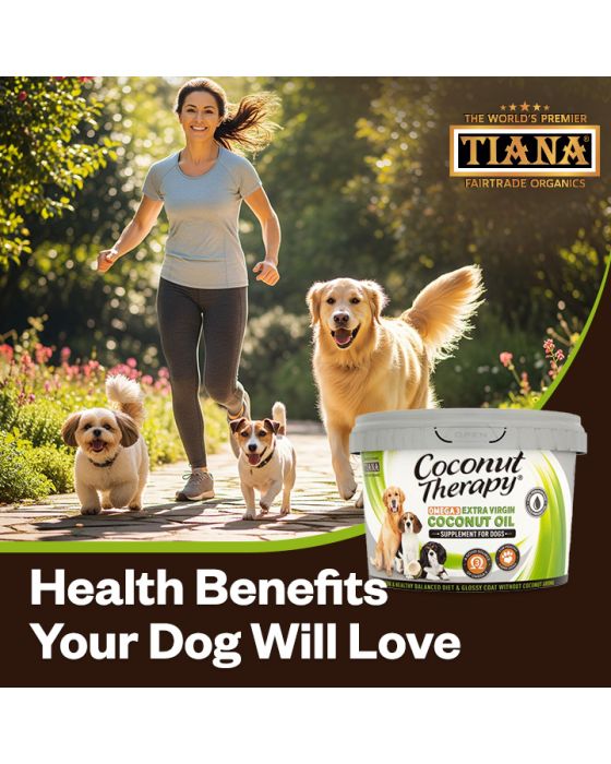 Look after your pet with TIANA Fairtrade Organics Coconut Therapy®, our Coconut Oil Omega-3 supplement. It’s not just coconut oil, it is a perfect complemetary supplement with essential fatty acids for your pet’s diet and a healthy glossy coat, whatever the breed, size and age. TIANA Coconut Therapy® is a unique formulation with 100% premium, raw, cold pressed extra virgin coconut oil (more beneficial than other lower quality oils), vegan Omega 3 essential fatty acids and fats which are some of the most important ingredients that should always be included into your pet’s diet. Our oil is unrefined for additional vitamins, shelf life and palatability.