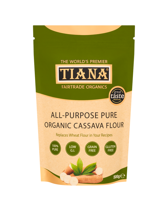 TIANA® Fairtrade Organics All-Purpose Cassava Flour is available in a 500 g recyclable and resealable paper pouch.