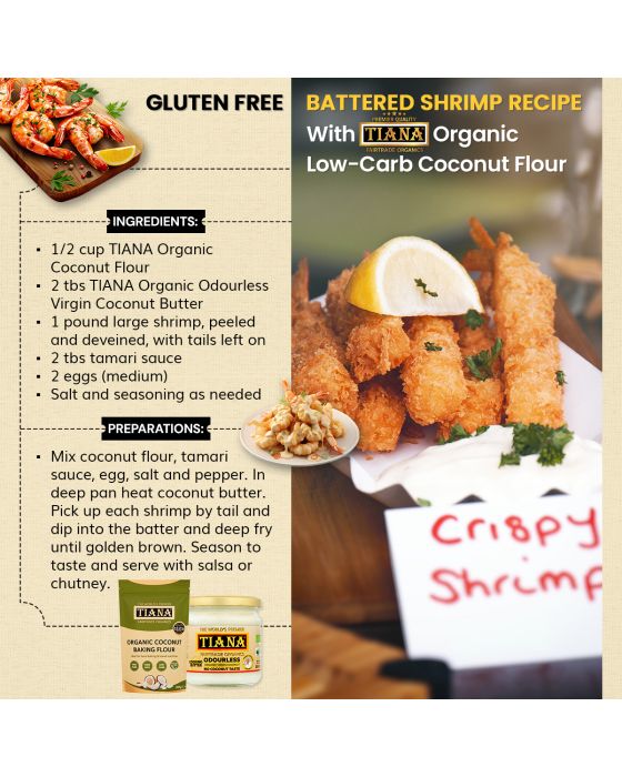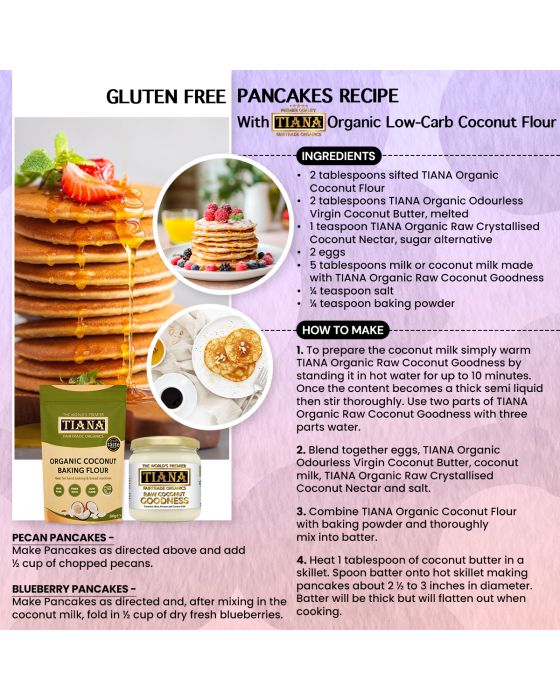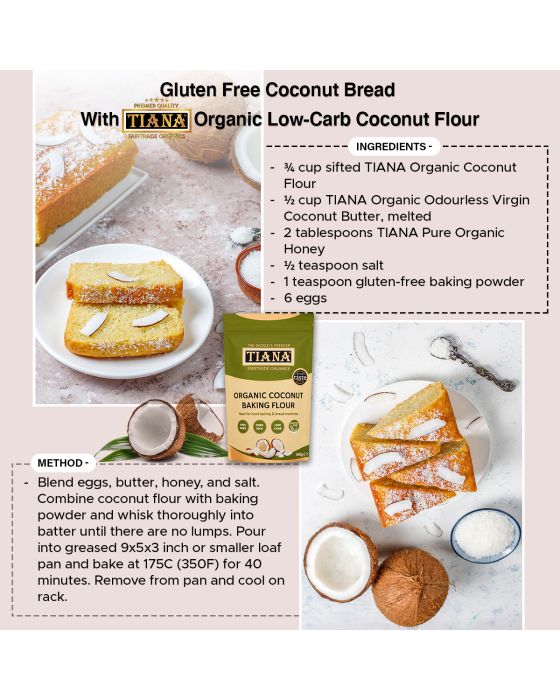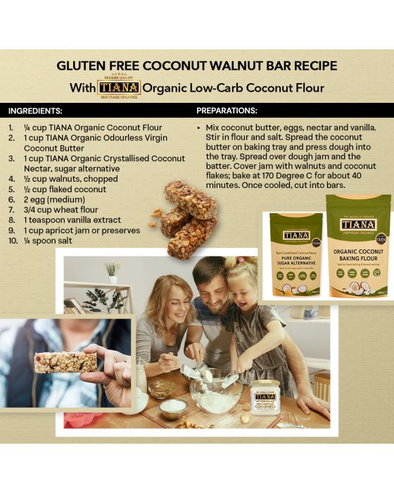 TIANA® Fairtrade Organic Coconut Baking Flour is a naturally gluten, nut and grain-free effective alternative to wheat and grain flours for those who have a gluten intolerance, as well as suitable for low-carbohydrate, high-fibre, low glycaemic and raw diets.