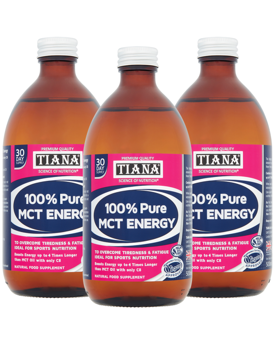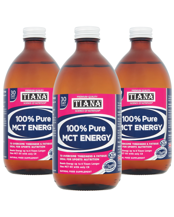 TIANA® High Strength 100% Pure MCT Energy is available in 300 ml (20-day supply) and 500 ml (30-day supply) recyclable glass bottles.